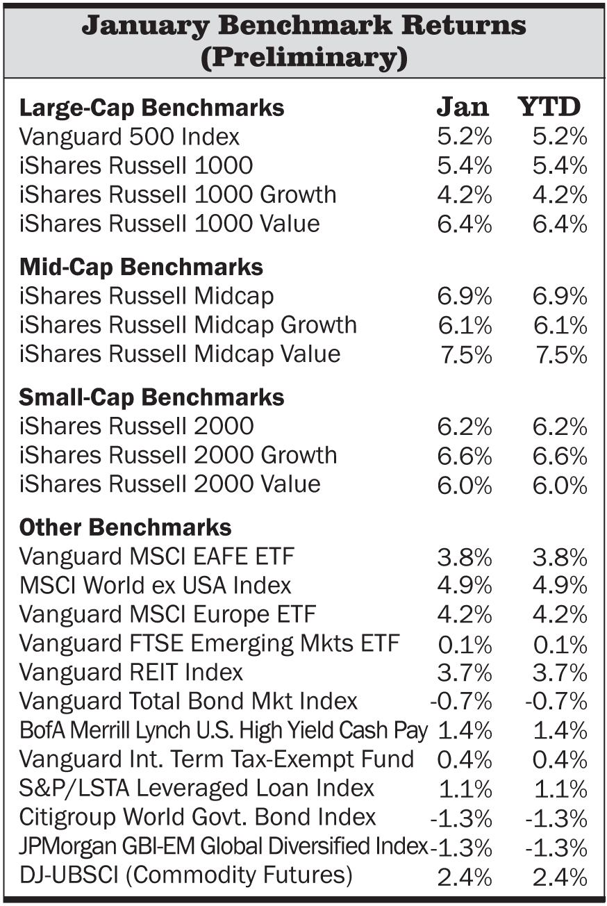 Stock markets logged their best January since the onset of the financial crisis. A resurgent demand for equity mutual funds reflected investor optimism over improving economic data and progress toward managing the fiscal cliff. Large-cap U.S. stocks rose 5% in January, while smaller-cap stocks gained 6%. Developed-market foreign stocks earned 4%, and emerging-markets equities were flat. As the yield on the 10-year Treasury climbed above 2%, domestic high-quality intermediate-term bonds declined 0.7%. Both foreign developed- and emerging-markets bonds fell 1.3%. Floating-rate loans, which we hold in our conservative accounts, rose 1.6% in January.